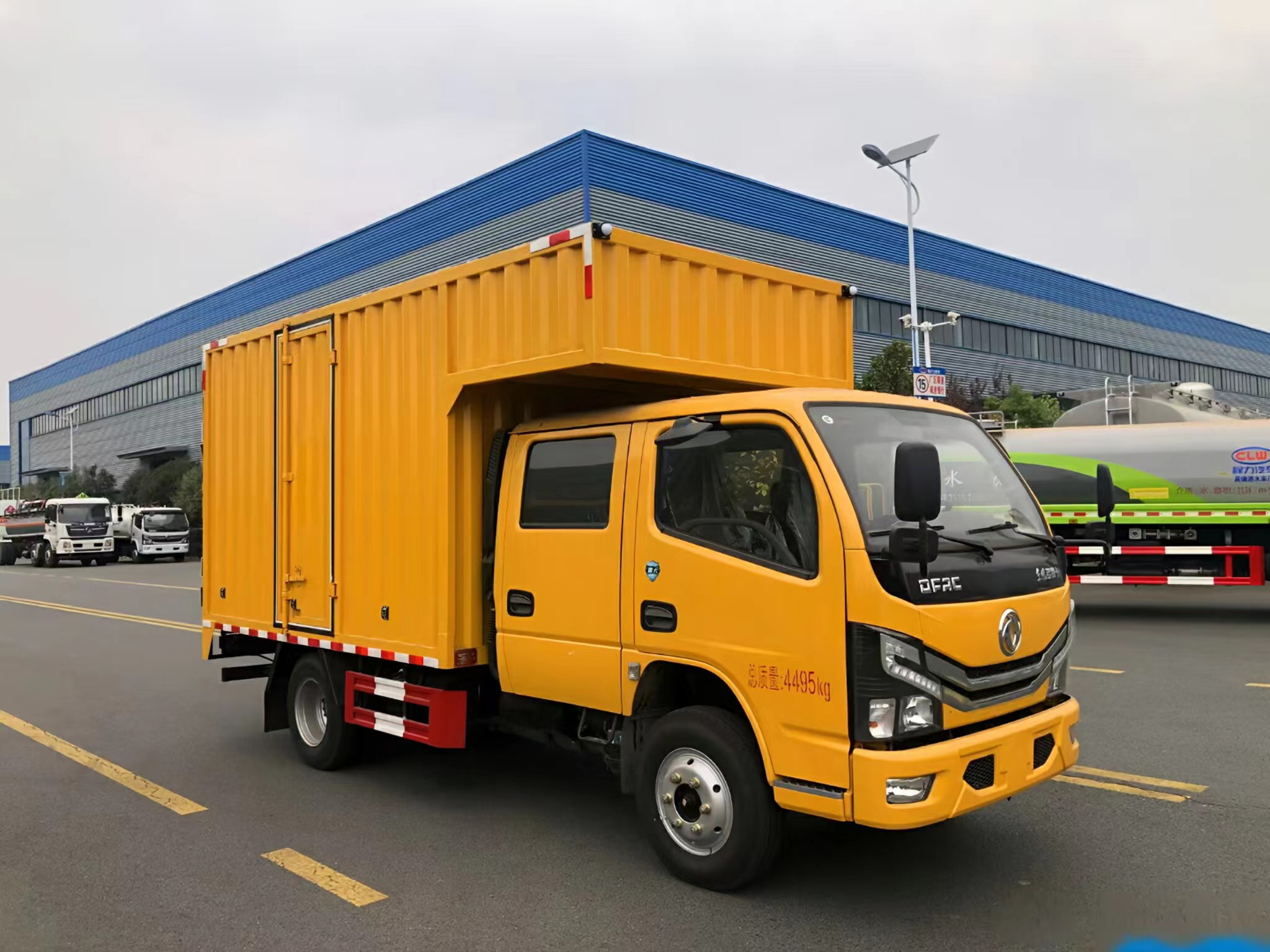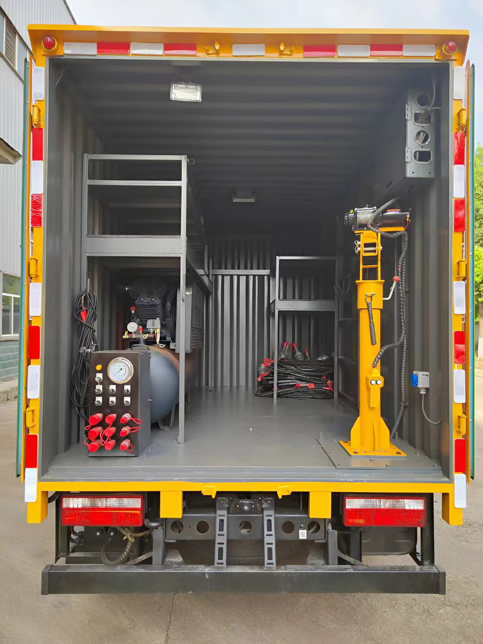 | 上裝配置 | 箱體采用瓦楞箱體,側(cè)面和后面各一個(gè)雙開門,箱內(nèi)設(shè)計(jì)兩個(gè)貨架,箱內(nèi)設(shè)計(jì)照明燈,安裝液壓動(dòng)力系統(tǒng),三套液壓動(dòng)力取力快速接口,帶控制面板兩臺4寸的渣漿泵,帶水帶和液壓管(帶快接)裝一個(gè)液壓驅(qū)動(dòng)空壓機(jī),一個(gè)800公斤12V電控小吊機(jī)安裝3500W逆變器,帶電控箱,其他程力專用車廠家標(biāo)配… | ||
