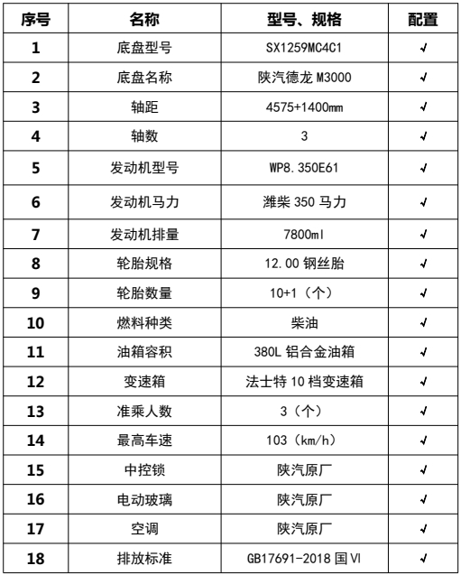 僅用軸距(mm):4575+1400,該車為路面同步碎石封層專用車輛,主要專用裝置為瀝青罐,碎石箱及灑布系統(tǒng).側(cè)防護材料:Q235,采用焊接連接,后防護為裙板結(jié)構(gòu),下緣離地高410mm,ABS系統(tǒng)生產(chǎn)廠家及型號分別為:西安正昌電子股份有限公司(ZQFB-V);選裝限速裝置,限速89km/h。后部照明燈僅在駐車狀態(tài)下使用,起夜間照明作用,行駛過程中不可點亮。隨底盤選裝駕駛室。